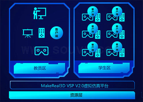 该解决方案包含显示硬件、MakeReal3D V2.0虚拟现实仿真平台及内容资源: