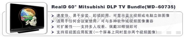 RealD DLP电视播放器是一款价廉物美的设备,可以播放清晰的大规格立体图像,是图文展示、建模和多用户浏览的理想解决方案。该产品包括一台DLP ®电视机(分为60英寸、65英寸、73英寸、82英寸)(152.4、165.1、185.42、208.28厘米)四种规格)和五副主动式眼镜(CE3眼镜配有发射器)。