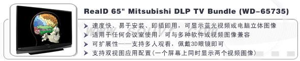 RealD DLP电视播放器是一款价廉物美的设备,可以播放清晰的大规格立体图像,是图文展示、建模和多用户浏览的理想解决方案。该产品包括一台DLP ®电视机(分为60英寸、65英寸、73英寸、82英寸)(152.4、165.1、185.42、208.28厘米)四种规格)和五副主动式眼镜(CE3眼镜配有发射器)。